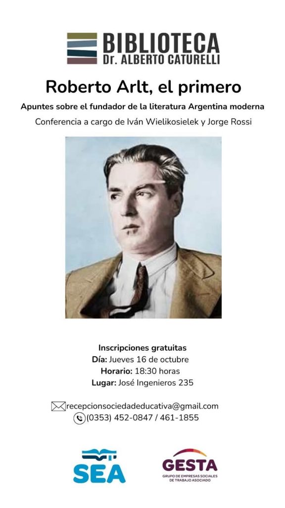 La Biblioteca Dr. Alberto Caturelli invita a participar de la conferencia “Roberto Arlt, el primero. Apuntes sobre el fundador de la literatura argentina moderna”, a cargo de Iván Wielikosielek y Jorge Rossi.