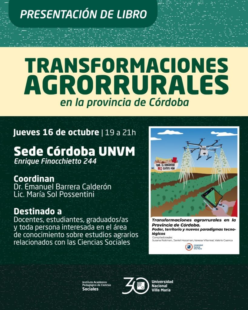 Se llevará a cabo la presentación del libro Transformaciones agrorrurales en la provincia de Córdoba. Poder, territorio y nuevos paradigmas tecnológicos en la Sede Córdoba de la Universidad Nacional de Villa María (Enrique Finocchietto 244).