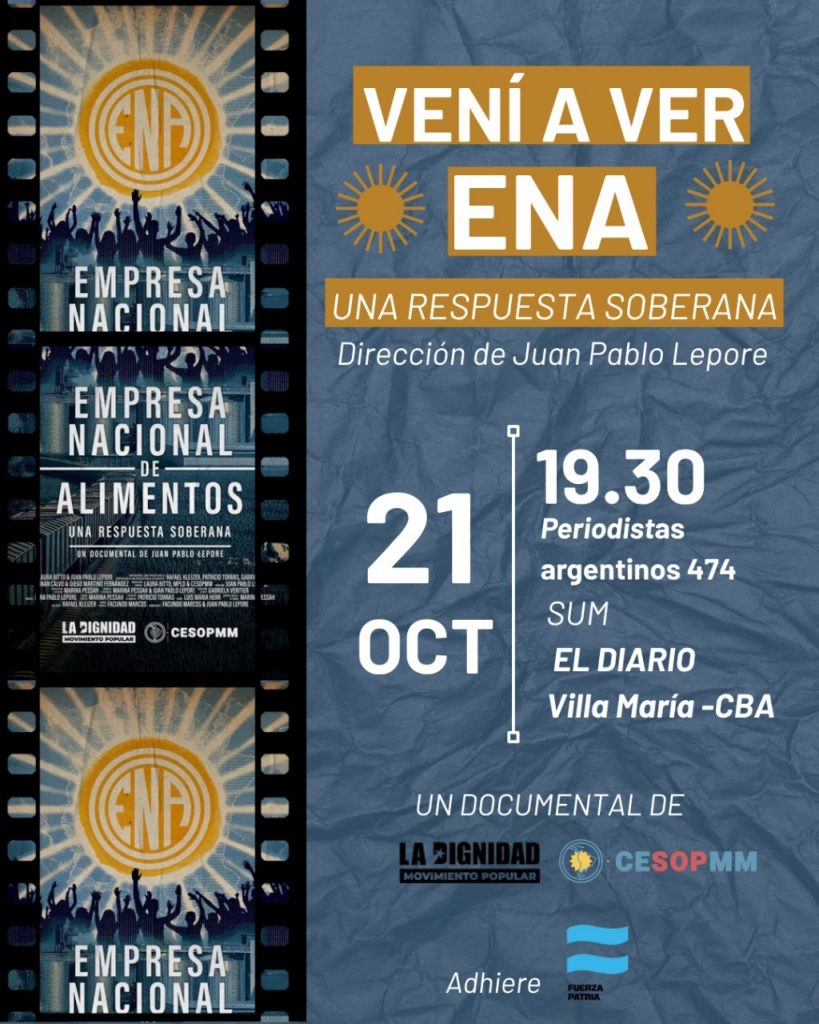 Este martes 21 de octubre, a las 19:30, se proyectará en el SUM de El Diario (Periodistas Argentinos 474, Villa María) el documental “Empresa Nacional de Alimentos: Una respuesta soberana”, dirigido por Juan Pablo Lepore.