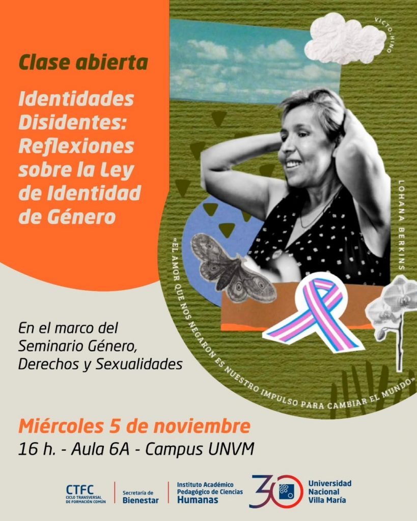 Este miércoles 5 de noviembre a las 16 h, se llevará a cabo la clase abierta “Identidades Disidentes: Reflexiones sobre la Ley de Identidad de Género”, en el Aula 6A del Campus UNVM. Conversamos con Juana Hidalgo de la Secretaría de Bienestar: